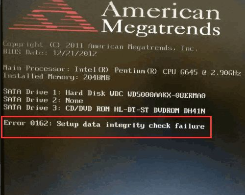 看了这个图片,Error0162是设置数据完整校验失败,如图。一般是BIOS自检出错,可以按F1键进入BIOS setup,加载缺省设置load Default,然后按F10,save and exit保存并退出。电脑会自动重启。