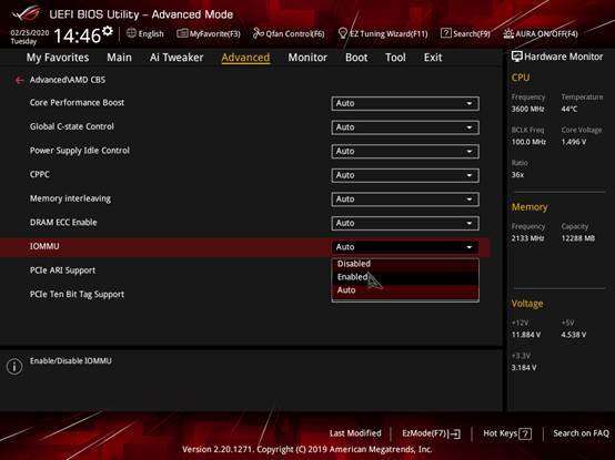 3. 选择Advanced页面的AMD CBS选项,将IOMMU设置为enabled,如下图: