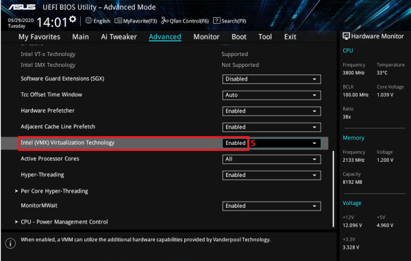 4. 点选[Intel(VMX) Virtualization Technology]选项并设置为[Enabled]