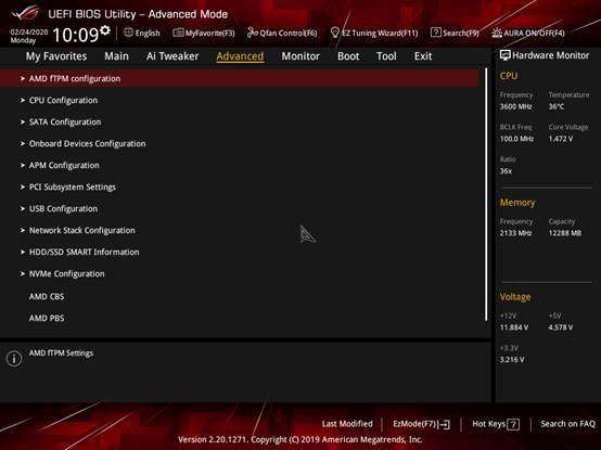 1. 计算机开机后,立刻按压键盘上的’delete’键,进入BIOS [Advanced Mode]页面