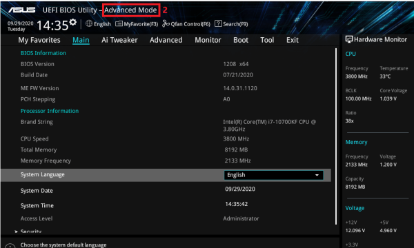 2. 按压键盘F7键,进入Advance Mode,如下图所示: