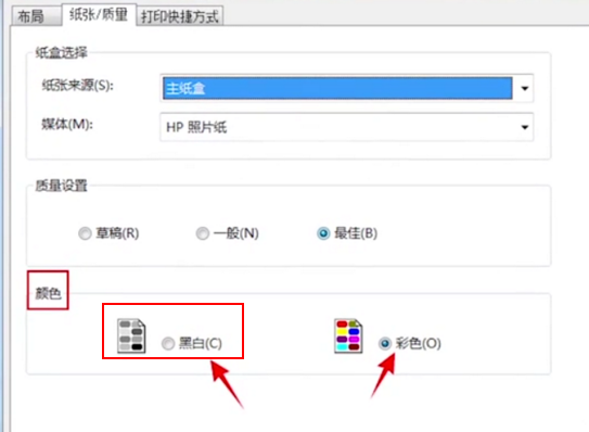 请检查打印时的设置,点击打开“纸张/质量”选项卡,查看“颜色”项是否选择了“黑白”打印。