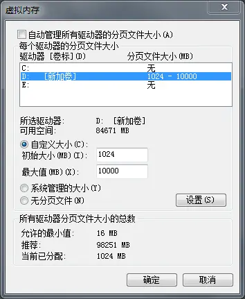 4、把系统盘选择“无分页文件”再点“设置”把其他盘选择“自定义大小”“最大值”设置为10000,然后点“设置”“确定”