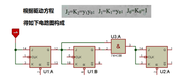 参考上图模5计数器,删去2输入与非门,电路就是一个模8计数器,Y(QcQbQa)=000,001,010......110,111,000........。