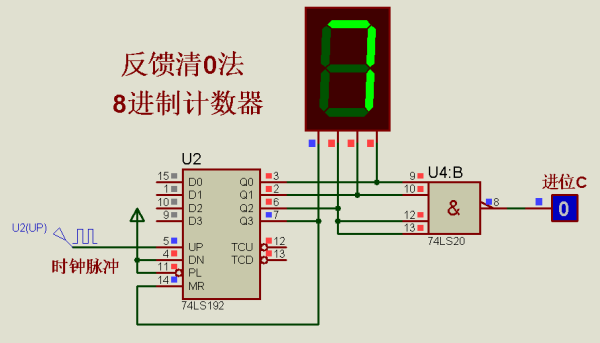 用74LS192,采用复位法改成8进制计数器,当计数到8时,Q3为1,作为复位信号接到复位端MR,即可复位回0。所以,最大数是7,则利用Q2Q1Q0=111经与非门输出低电平作为进位C信号。逻辑图即仿真图如下。