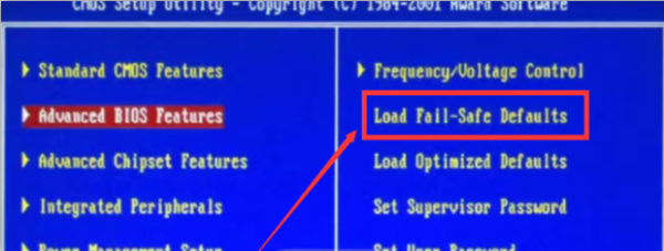 解决:只要恢复BIOS默认值——开机或者重启电脑按住DEL键,进入BIOS;找到 Load Fail-Safe Defaults ,按方向键选中后回车,提示是否确定,按Y,回车。 最后选择Save&exit step对以上的步骤进行保存。