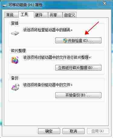 选中U盘,鼠标右键单击,选下出现的选项菜单下面的“属性”,然后在出现的窗口中选择“工具”,点击最上面的“开始检查”,然后按提示操作即可,如下图所示:【回答】