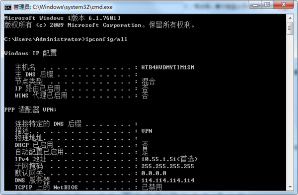 /all”,按下回车键,显示其网络配置,检查IP地址,子网掩码,默认网关,DNS服务器地址是否正确。