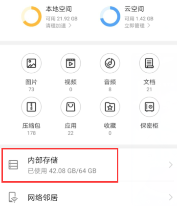 二、打开华为文件管理器后,点击打开“内部存储”。
