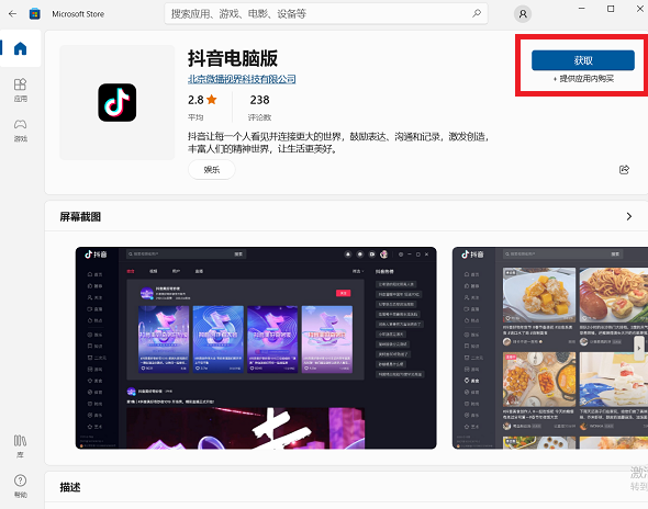 2、在抖音的界面中,点击右边的【获取】按钮,就可以进行下载获取。