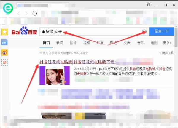 1、首先,打开浏览器,搜索电脑版抖音,然后在结果中单击搜索结果以进入网页。