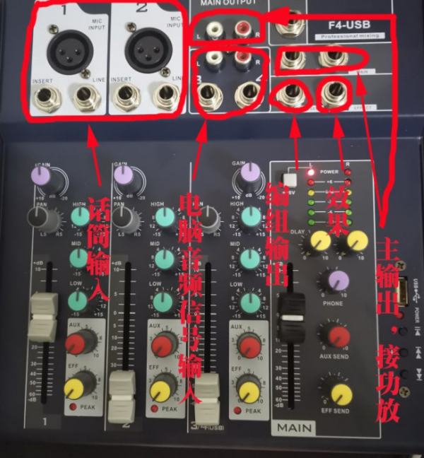 它有两组输出接功放,哪一组都可以。其它的都标注了。如图。麦克风可以插line里,也可以用大的接口(卡侬口)