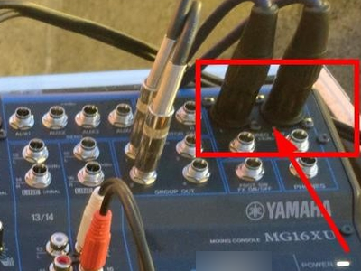 1、首先将连接功放的线的一头连接到调音台的总输出,如下图红色箭头所指。