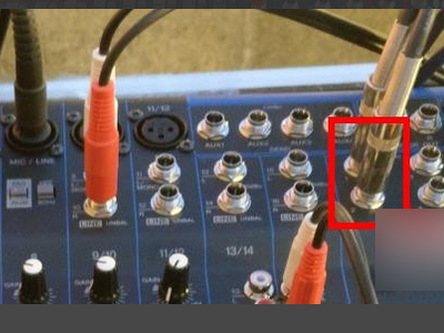 3、将连接返听的功放一头插到调音台的输出,如下图红色框选。