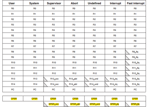 Bit0 P 在ARM中有6个状态寄存器,ARM7TDMI内核包含1个CPSR和5个供异常处理程序使用的SPSR。CPSR反映了当前处理器的状态,其包含: