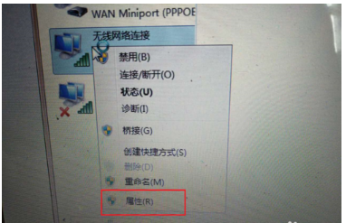 如果是无线网络设置问题,找到无线网络单击右键,找到对话框最下面的属性,单击左键。