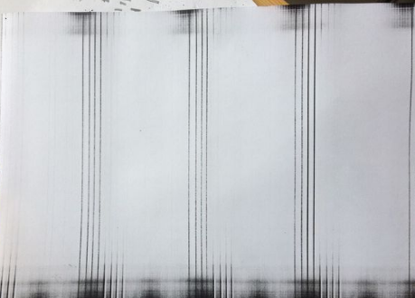 3、打印文件上出现纵向得细黑道:通常是刮板和刮板边上的小刮片粘上了脏东西或者碎纸屑。