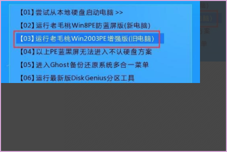 1、首先在主菜单界面用键盘方向键“↓”将光标移至“【03】运行老毛桃Win2003PE增强版(旧电脑)”,回车确定。
