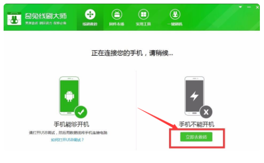 1,打开奇兔线刷大师的界面后,会出现两个选项。第一个是可以正常开机的选项,而第二个是无法正常开机的选项。下面进行比较普遍的无法正常开机的救砖流程。