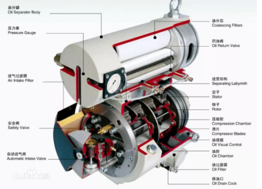 无油空气压缩机是属于微型往复式活塞式压缩机,电机单轴驱动对称分布曲柄摇杆机械结构,主运动付为活塞环,副运动付为铝合金圆柱面,运动付之间同活塞环自润滑而不添加任何润滑剂。