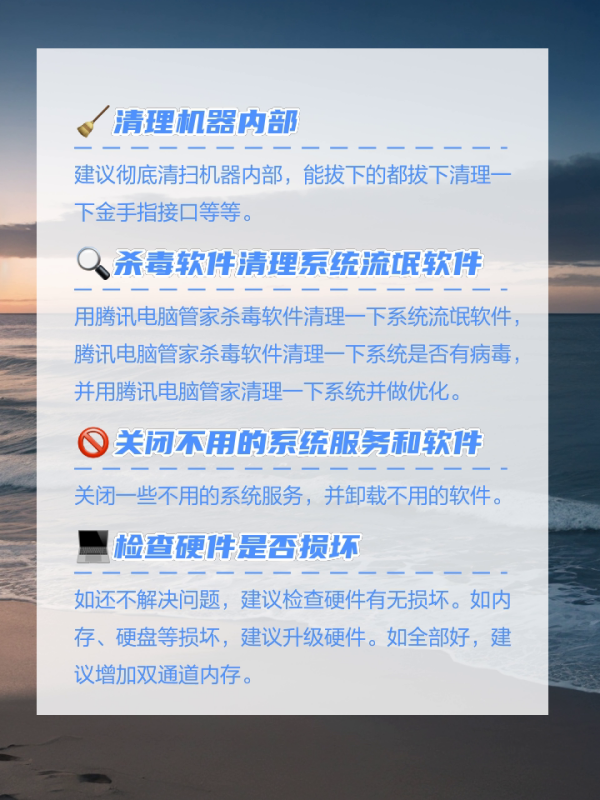 如还不解决问题,建议检查硬件有无损坏。如内存、硬盘等损坏,建议升级硬件。如全部好,建议增加双通道内存。