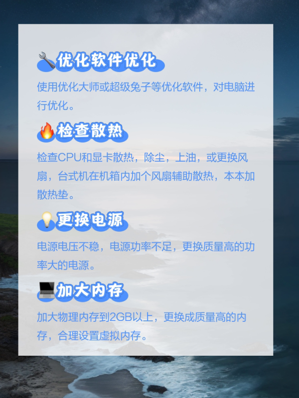 检查CPU和显卡散热,除尘,上油,或更换风扇,台式机在机箱内加个风扇辅助散热,本本加散热垫。