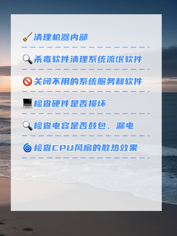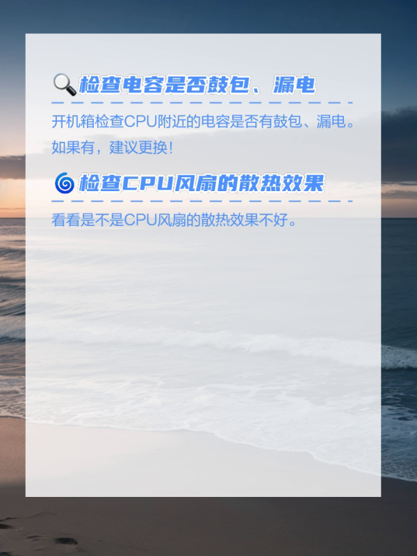 开机箱检查CPU附近的电容是否有鼓包、漏电。如果有,建议更换!