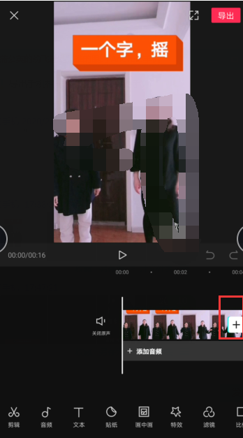 3、打开比例设置界面→点击“9:16”,然后→点击“返回”图标。现在的画面已经变成上下黑屏中间视频。选中视频素材,在上方展示区域,用手指拉伸视频大小。使其满屏播放。这样剪辑出来的视频就可以全屏播放了。
