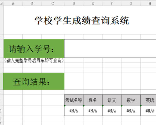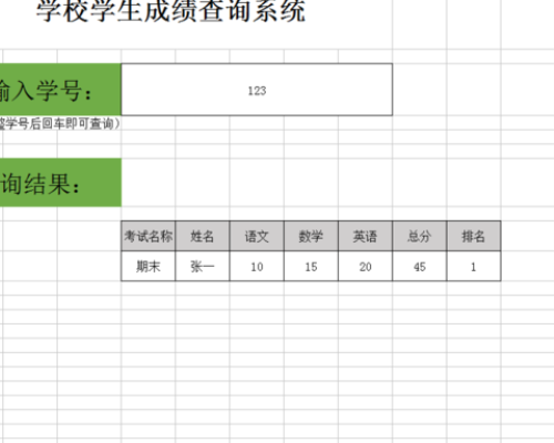 2、在sheet1中建立好查询系统的主页面,以学号为查询条件,结果显示对应学号学生的各科目成绩及其总分和排名。