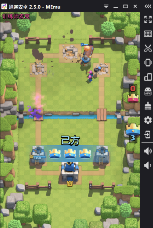 游戏界面中有国王塔和女王塔,摧毁1个女王塔,获得1个皇冠,摧毁国王塔(主塔),获得全部3个皇冠。