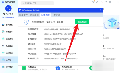 点击测试网速界面的全面检查按钮完成操作。