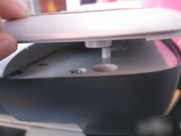 2、用刀片将粘纸撬开看到一个螺丝。用螺丝刀拧开。