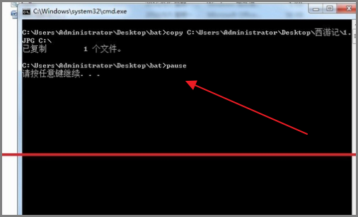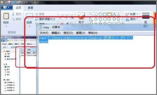 3、右键打开文件,第一行输入“copy C:\Users\Administrator\Desktop\西游记\1.JPG C:\”。