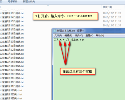2、打开这个文本文档,输入以下命令:DIR *.* /B >list.txt。