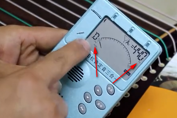 3、把古筝的盖子打开,然后把调音器放到古筝上(调音时以显示器中间的数字为准,后面的英文字母不用管),先对准数字,再对准红绿灯。