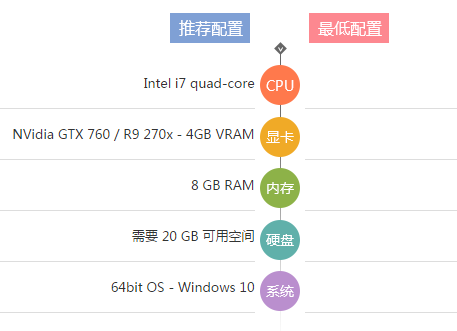 系统为64bit OS - Windows 10;处理器为Intel i7 quad-core;内存为8 GB RAM;图形为NVidia GTX 760 / R9 270x - 4GB VRAM;存储需要20GB可用空间。