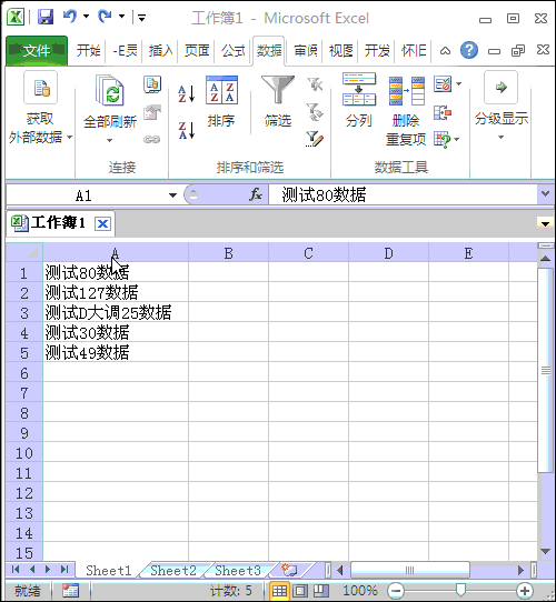 1、选中A1:A5,拉动边线调整列宽为1个字符
