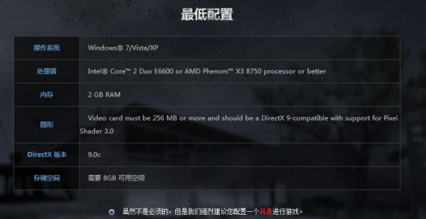 显卡:显卡至少为256MB或更高,兼容DirectX 9并支持像素着色器3.0