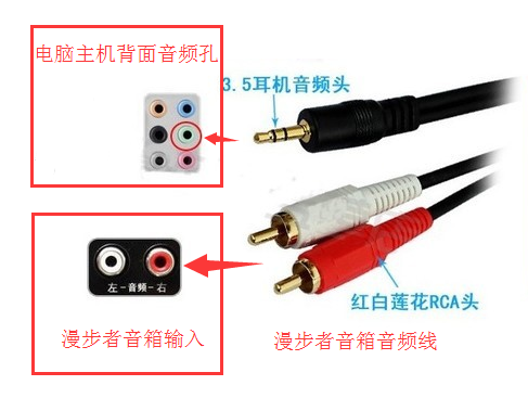 漫步者电脑音箱安装到电脑上,需要将漫步者音箱的音频线连接音箱输入和电脑音频输出孔。