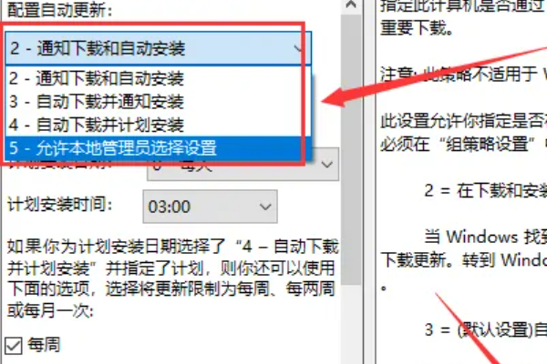 下面的选项会呈可选状态,可以设置、通知下载并通知安装、自动下载并通知安装、自动下载并计划安装、允许本地管理员选择设置,点击应用保存退出。