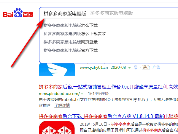 1、首先,打开计算机的浏览器,输入[拼多多商家版电脑版]进行搜索。