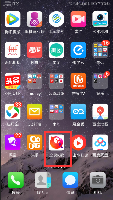 1、打开手机界面,找到“全民K歌”软件