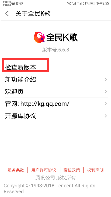 6、打开“关于全民K歌”的界面,点击“检查新版本”选项,进行更新