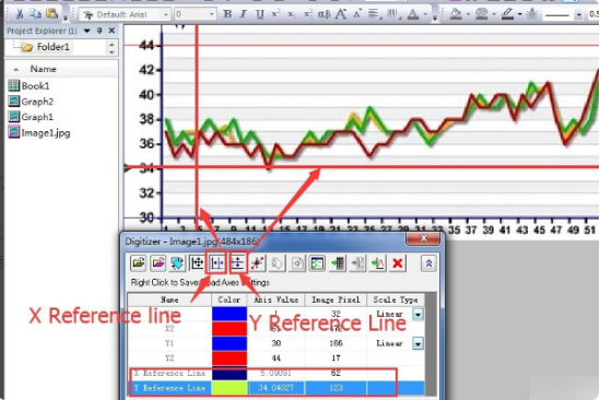 3、设置X和Y坐标,在数字化仪中,有四个坐标:x1、x2、y1和y2。对应图中有四行。单击数字化仪上方的第四个按钮以显示X参考线,单击第五个按钮以显示Y参考线。