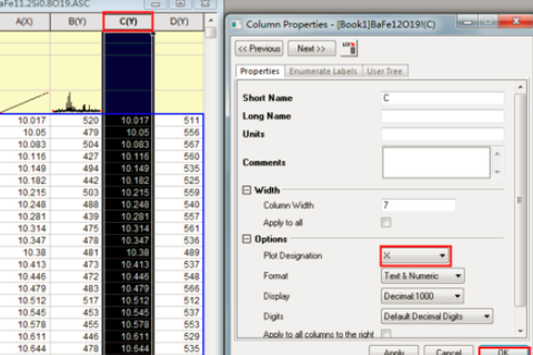 1、打开origin画图,将需要的数据放入到数据框,并把坐标改成XY形式。如图: