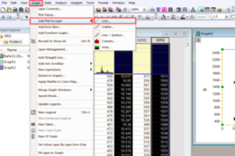 4、继续选择另一个需要的数据原始X轴及改后Y轴。点击第一次修改的图,选择Graph-Add Plot to Layer-line,两张图就画到一起了。