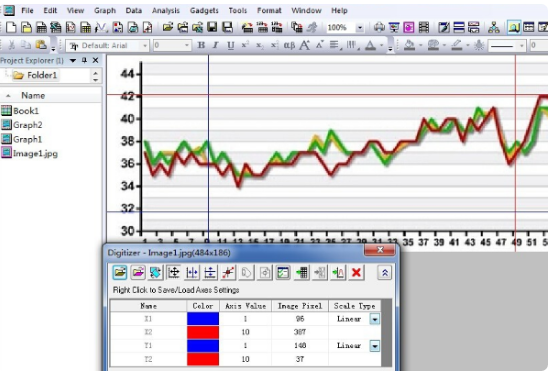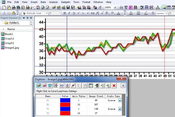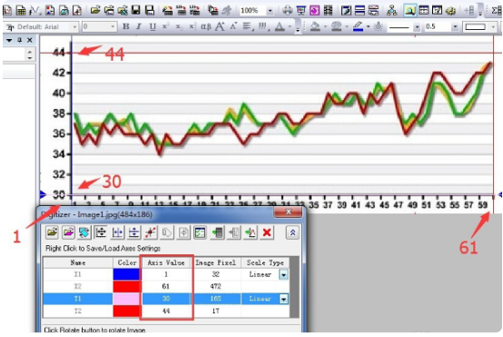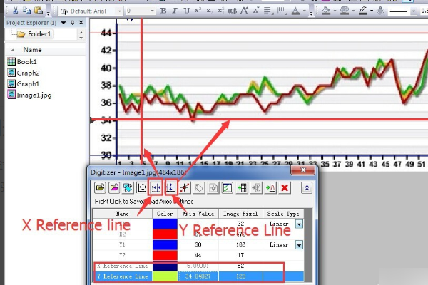 3、设置x和y坐标,在Digitizer中,有x1、x2、y1、y2四个坐标,对应图中有4条线,点击Digitizer上面第4个按钮可显示x参考线,第5个按钮可显示y参考线。