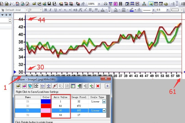 4、将x1的Axis Value值设置为1,并将图上对应的垂线移动到横坐标1处,x2的Axis Value值设置为61,并将图上对应的垂线移动到横坐标61处 ,y1、y2按上面方法设置好便可进入下一步。