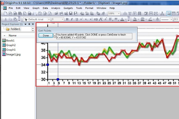 6、选择数据,选择digitizer对话框Pick New Points,然后在线上双击便会在此确定一个点,后面的表格中会记录此点的数据。软件会根据这些点自动连成红色的线,如图将曲线抠了出来。