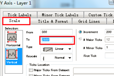 3、鼠标点击坐标轴,在出现的页面中找到Scale,将纵坐标To值修改为2500,如图: